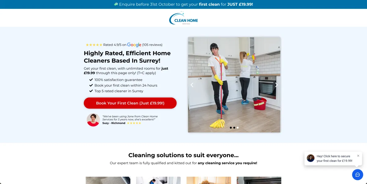 What sets your cleaning service apart? Whether it’s a satisfaction guarantee, eco-friendly products, or rapid booking, make sure your value proposition is visible immediately.